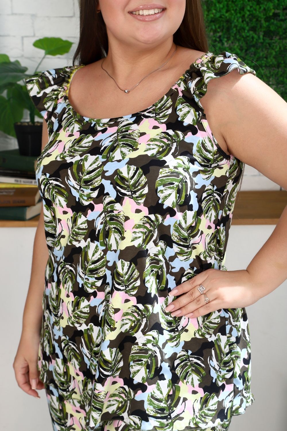 Костюм женский из топа и брюк. Брюки широкие, с карманами. Топ на бретелях-крылышках.