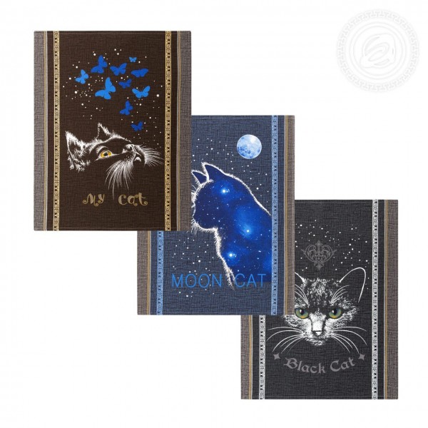 Эксклюзивный дизайн «Лунный кот» погружает в атмосферу тайн и загадок. На темном фоне черный кот – волшебный герой, который появляется в ночи с восходом Луны. Новогодний рисунок выполнен в интересной стилистике с сочетанием темно-коричневого и темно-синего цветов. На каждом полотенце из рогожки – мордочка кота с яркими глазами.