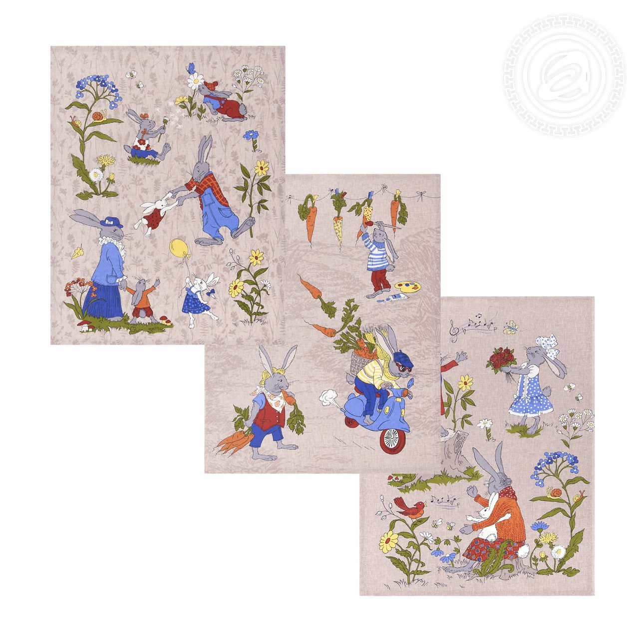«Морковкино» - красивый и забавный дизайн на полотенцах из рогожки. Перед нами будто фотографии-зарисовки из семейного альбома зайцев. Вот папа кружит сынишку, мама ведет зайчонка в школу, лапочка-дочка бегает по траве с воздушным шариком, а вот бабушка рассказывает малышу добрую сказку.